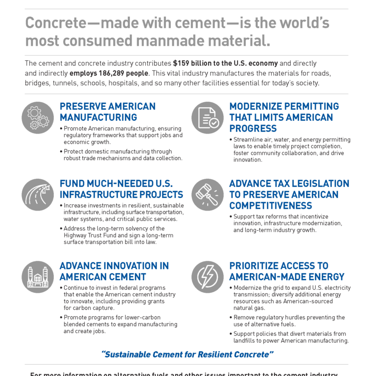 The American Cement Association is the voice of America’s cement manufacturers. Our Government Affairs team works hard to develop constructive relationships with policymakers and agency leadership, sharing up-to-do date information and communicating the value and sustainability of our products, so that together we can build a greener, safer, and more resilient nation.