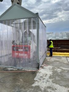 To protect employees’ lung health during barge unloading, the team designed a mobile Bobcat cleaning hut that captures airborne dust. Operators park the Bobcat inside, then use a blow wand from outside through plastic-skirted walls. A built-in vacuum port connects to the unloading system to collect dust. Mounted on caster wheels with crane lift points, the unit is easy to move and disassemble. This innovation reduces dust exposure, improves air quality, and significantly lowers respiratory health risks for workers.